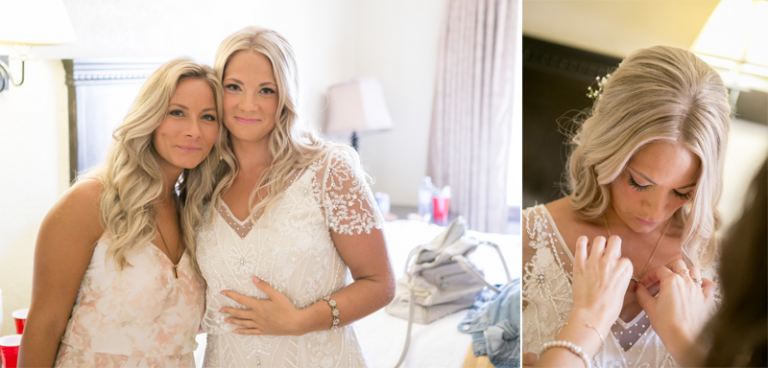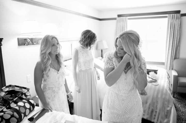 Bride sitting on bed with dress in wedding Bride getting makeup doneBride smiling in gown black and whiteBride's mom doing up her dressBride and bridesmaids laughing on bedBride putting on shoesgroom buttoning up shirtgroom putting on watchgroom's jacket stitched with wedding dategroom fixing tiegroomsmen relaxing outside before wedding